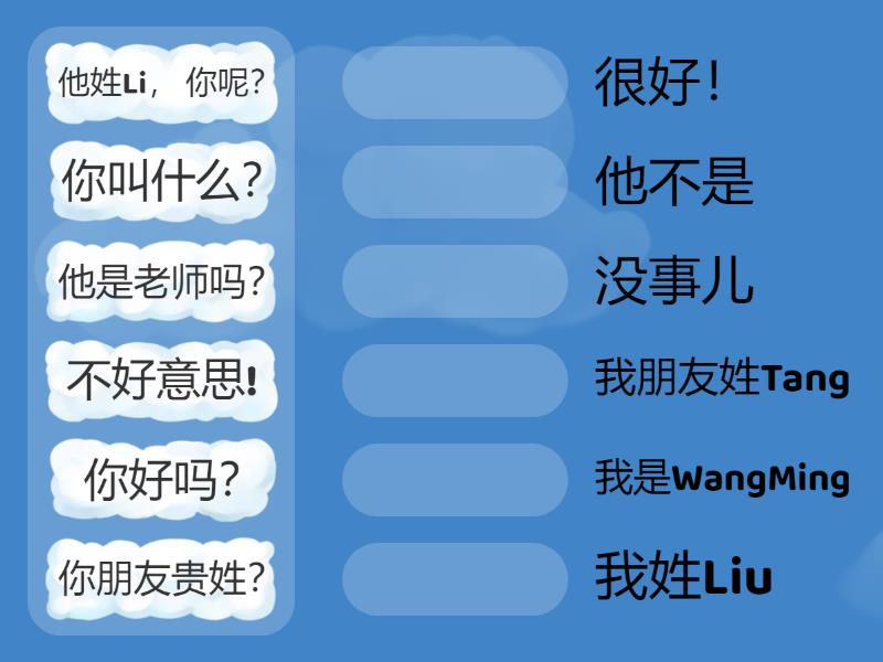 他是老师吗? - 他不是, 你叫什么? - 我是WangMing, 他姓Li, 你呢? - 我姓Liu, 不好意思! - 没事儿, 你朋友贵姓? - 我朋友姓Tang, 你好吗? - 很好!,