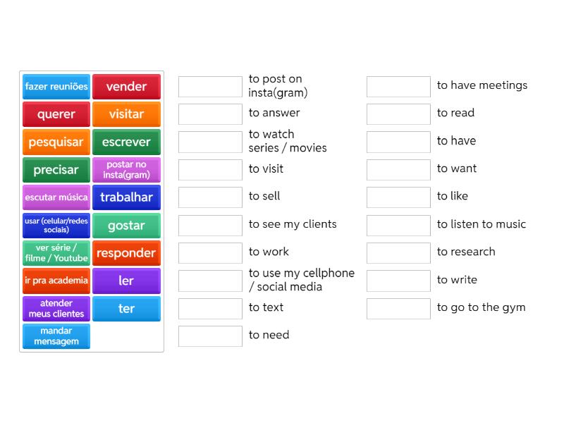 vender - to sell, atender meus clientes - to see my clients, visitar - to visit, fazer reuniões - to have meetings, ir pra academia - to go to the gym, pesquisar - to research, ler - to read, postar no insta(gram) - to post on insta(gram), escrever - to write, querer - to want, precisar - to need, ter - to have, gostar - to like, escutar música - to listen to music, ver série / filme / Youtube - to watch series / movies, usar (celular/redes sociais) - to use my cellphone / social media, mandar mensagem - to text , trabalhar - to work, responder - to answer,