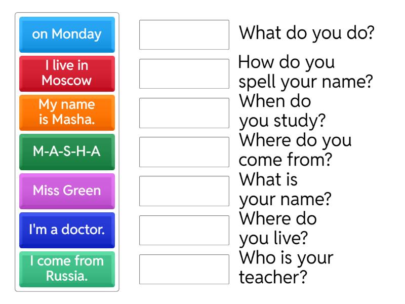 I live in Moscow - Where do you live?, My name is Masha. - What is your name?, M-A-S-H-A - How do you spell your name?, I'm a doctor. - What do you do?, I come from Russia. - Where do you come from?, Miss Green - Who is your teacher?, on Monday - When do you study?,
