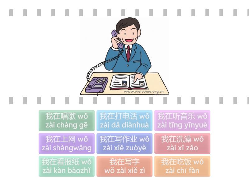 我在打电话 wǒ zài dǎ diànhuà, 我在洗澡 wǒ zài xǐ zǎo, 我在吃饭 wǒ zài chī fàn, 我在唱歌 wǒ zài chàng gē, 我在听音乐 wǒ zài tīng yīnyuè, 我在写作业 wǒ zài xiě zuòyè, 我在看报纸 wǒ zài kàn bàozhǐ, 我在写字 wǒ zài xiě zì, 我在上网 wǒ zài shàngwǎng,