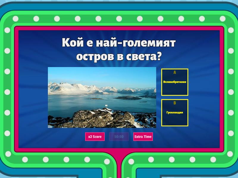 1) Кой е най-големият остров в света? a) Великобритания b) Гренландия 2) Коя държава произвежда най-много кафе в света? a) Бразилия b) Ажентина 3) Коя държава притежава всяка панда в света? a) САЩ b) Япония c) Китай 4) Във филма Бейб, какъв тип животно е Бейб? a) куче b) прасе c) котка 5) Какво е най-твърдото природно вещество, което е известно? a) дамант b) кристал 6) Камион се движи към селото и срещата три коли! Колко превозни средства пътуват към селото? a) 3 b) 4 c) 1 7) Коя гума не се върти, когато колата завива надясно? a) лявата b) дясната c) друг 8) Какъв цвят с черните кутии на самолетите? a) черни b) оранжеви c) червени 9) Кой анимационен герой живее в ананас под морето? a) Спондж Боб b) Мики маус c) Патрик
