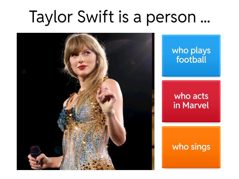 1) Taylor Swift is a person ... a) who plays football b) who acts in Marvel c) who sings 2) Tom Holland is an actor ... a) who sings opera on stage b) who plays Spider-man in Marvel c) who drives Formula 1 cars 3) Ariana Grande is a person a) who was born in USA b) who has many Oscars c) who races motorcycles d) who was born in London 4) Dybala is a football player a) who sings Latin pop b) who is married with Ariana Martinez c) who is married with Oriana Sabattini d) who writes novels about science fiction 5) The Golden Gate Bridge is a place a) which hosts music concerts every weekend b) where is a symbol of freedom in the USA c) which connects San Francisco to Marin County d) where you can play tenis 6) A cinema is a place a) where you can buy shoes b) which I can sit and have lunch c) where you can enjoy and watch movies 7) This is the school a) where I met my best friend b) which I met my best friend 8) This is the school a) where I mentioned you b) which i mentioned you