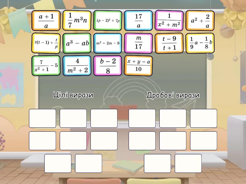 Цілі вирази: , , , , , , , , Дробові вирази: , , , , , , , ,
