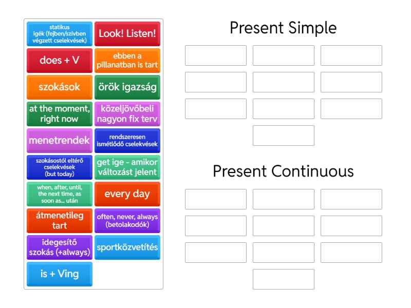 Present Simple: örök igazság, szokások, rendszeresen ismétlődő cselekvések, statikus igék (fejben/szívben végzett cselekvések), sportközvetítés, menetrendek, often, never, always (betolakodók), when, after, until, the next time, as soon as... után, every day, does + V, Present Continuous: ebben a pillanatban is tart, szokásostól eltérő cselekvések (but today), átmenetileg tart, idegesítő szokás (+always), közeljövőbeli nagyon fix terv, Look! Listen!, at the moment, right now, get ige - amikor változást jelent, is + Ving,