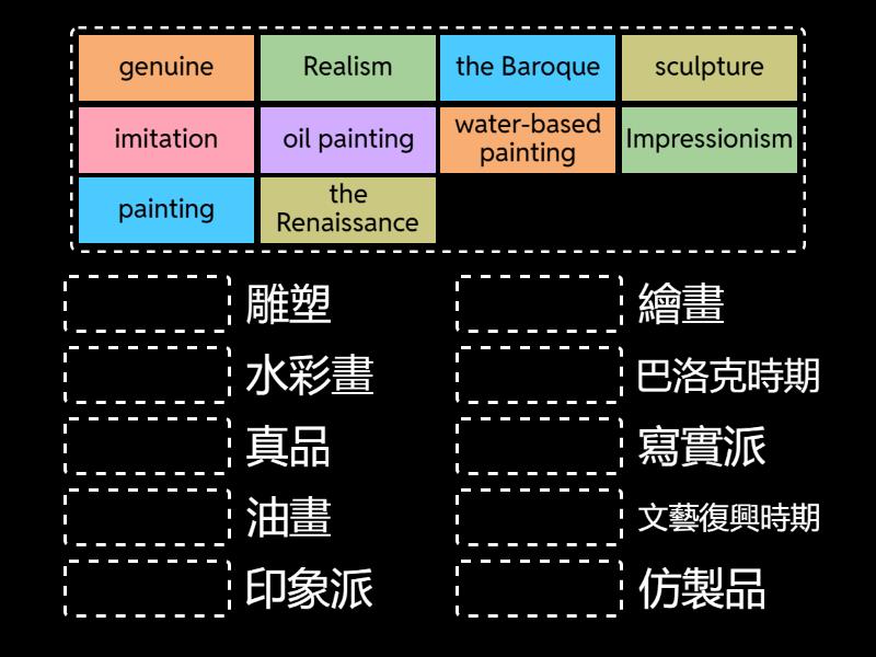 painting - 繪畫, oil painting - 油畫, water-based painting - 水彩畫, the Renaissance - 文藝復興時期, the Baroque - 巴洛克時期, sculpture - 雕塑, genuine - 真品, imitation - 仿製品, Realism - 寫實派, Impressionism - 印象派,