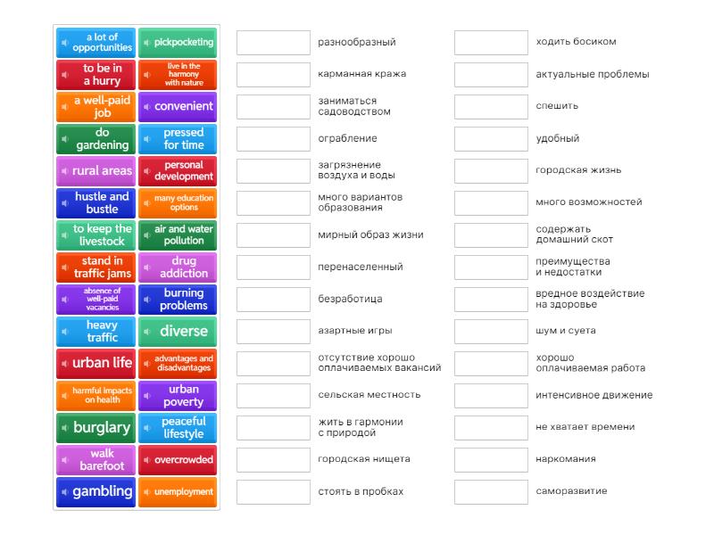 hustle and bustle - шум и суета, peaceful lifestyle - мирный образ жизни, rural areas - сельская местность, advantages and disadvantages - преимущества и недостатки, urban life - городская жизнь, convenient - удобный, a lot of opportunities - много возможностей, many education options - много вариантов образования, a well-paid job - хорошо оплачиваемая работа, personal development - саморазвитие, diverse - разнообразный, burning problems - актуальные проблемы, heavy traffic - интенсивное движение, stand in traffic jams - стоять в пробках, to be in a hurry - спешить, pressed for time - не хватает времени, overcrowded - перенаселенный, air and water pollution - загрязнение воздуха и воды, harmful impacts on health - вредное воздействие на здоровье, urban poverty - городская нищета, pickpocketing - карманная кража, burglary - ограбление, gambling - азартные игры, drug addiction - наркомания, unemployment - безработица, live in the harmony with nature - жить в гармонии с природой, walk barefoot - ходить босиком, to keep the livestock - содержать домашний скот, do gardening - заниматься садоводством, absence of well-paid vacancies - отсутствие хорошо оплачиваемых вакансий,