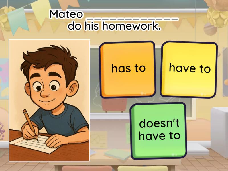 1) Mateo ____________ do his homework. a) has to b) have to c) doesn't have to 2) Laura ____________ sweep the street. a) has to b) doesn't has to c) doesn't have to 3) Mom ____________ prepare lessons. a) have to b) has to c) doesn't have to 4) Dad___________ wash the dishes. a) have to b) has to c) doesn't have to 5) They ____________ clean the house together. a) has to b) have to c) doesn't have to 6) Mateo ____________ cook at home. a) have to b) doesn't has to c) doesn't have to 7) Mateo and Laura ____________ go to school. a) has to b) have to c) doesn't have to