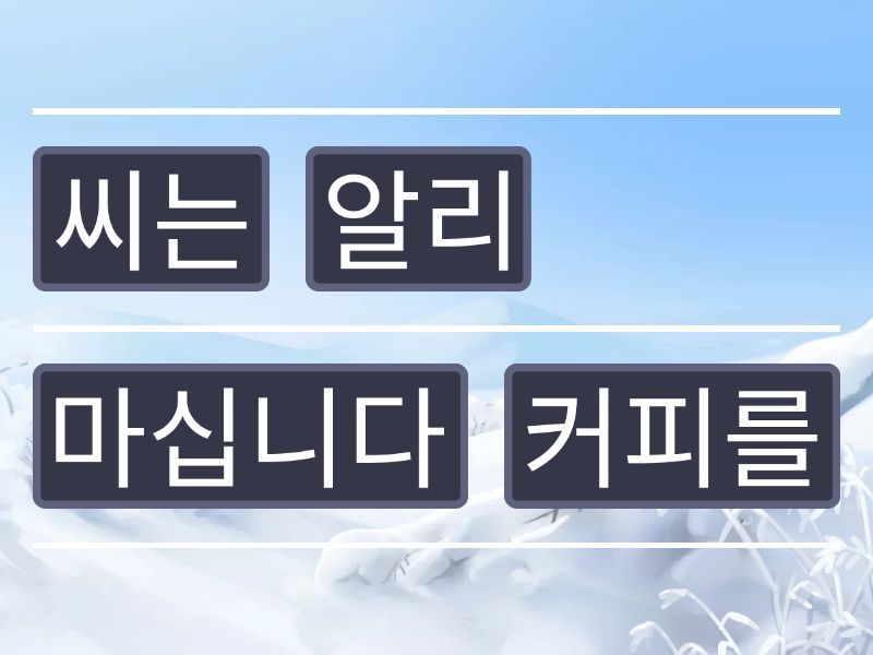 알리 씨는 커피를 마십니다, 지영 씨는 책을 읽습니다, 제가 사과를 먹습니다, 친구가 편지를 씁니다, 왕준 씨가 선생님을 만납니다, 어머니가 빵을 먹습니다, 어느 나라 사람입니까?, 미연 씨는 한국어를 공부합니다 , 저는 음악을 듣습니다, 그 사람은 꽃을 삽니다,