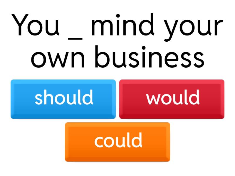 1) You _ mind your own business a) should b) would c) could 2) What _ you like to do tonight? a) should b) would c) could 3) Miriam _ be here any minute a) should b) would c) could 4) Teacher _ you please explain it again?  a) should b) would c) could 5) Norman promised he _ never behave that way again a) should b) would c) could 6) You _ arrive before the boss does  a) should b) would c) could 7) At four my sister _ already speak 2 languages  a) should b) would c) could 8) What _ you do if you were offered the management? a) should b) would c) could 9) The delivery _ be done tonight a) should b) would c) could 10) Andy _ eat everything he wanted  a) should b) would c) could