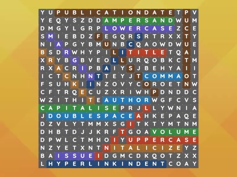 ampersand, margin, initial, comma, full stop, italics, italicize, capitalise , lowercase, uppercase , double space, puctuation, hyperlink, bracket, volume, issue, title , author, publication date , indent,