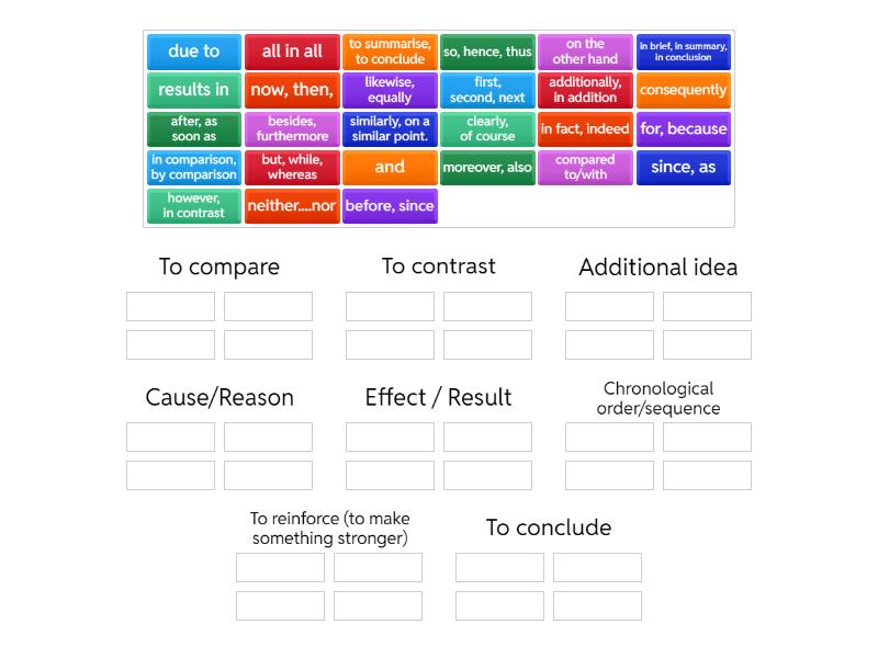 To compare: in comparison, by comparison, similarly, on a similar point., likewise, equally, neither....nor, To contrast: but, while, whereas, on the other hand, however, in contrast, compared to/with, Additional idea: additionally, in addition, besides, furthermore, moreover, also, and, Cause/Reason: for, because, since, as, due to, Effect / Result: results in, so, hence, thus, consequently, Chronological order/sequence: first, second, next, now, then, , after, as soon as, before, since, To reinforce (to make something stronger): in fact, indeed, clearly, of course, To conclude: all in all, in brief, in summary, in conclusion, to summarise, to conclude,