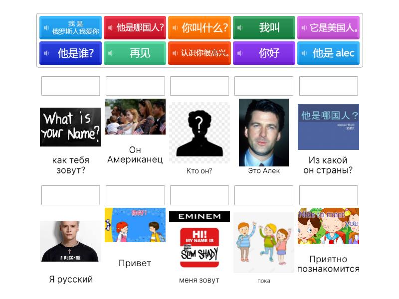 我  是  俄罗斯人我爱你 - Я русский, 你好 - Привет, 再见 - пока, 我叫 - меня зовут, 你叫什么? - как тебя зовут?, 认识你很高兴。 - Приятно познакомится, 他是谁? - Кто он?, 他是 alec - Это Алек, 他是哪国人? - Из какой он страны?, 它是美国人。 - Он Американец,