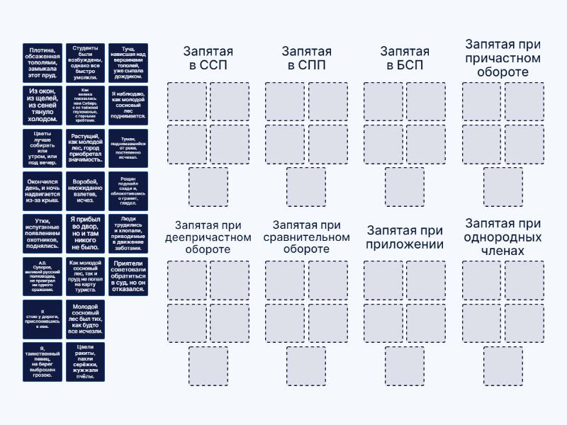 Запятая в ССП: Окончился день, и ночь надвигается из-за крыш., Приятели советовали обратиться в суд, но он отказался., Я прибыл во двор, но и там никого не было., Студенты были возбуждены, однако все быстро умолкли., Запятая в СПП: Я наблюдаю, как молодой сосновый лес поднимается., Молодой сосновый лес был тих, как будто все исчезли., Запятая в БСП: Цвели ракиты, пахли серёжки, жужжали пчёлы., Запятая при причастном обороте: Туча, нависшая над вершинами тополей, уже сыпала дождиком., Туман, поднимавшийся от реки, постепенно исчезал., Утки, испуганные появлением охотников, поднялись., Люди трудились и хлопали, приводимые в движение заботами., Плотина, обсаженная тополями, замыкала этот пруд., Запятая при деепричастном обороте: Я стою у дороги, прислонившись к иве., Воробей, неожиданно взлетев, исчез., Рощин подошёл сзади и, облокотившись о гранит, глядел., Запятая при сравнительном обороте: Растущий, как молодой лес, город приобретал значимость.., Запятая при приложении: Я, таинственный певец, на берег выброшен грозою., А.В. Суворов, великий русский полководец, не проиграл ни одного сражения., Запятая при однородных членах: Цветы лучше собирать или утром, или под вечер., Из окон, из щелей, из сеней тянуло холодом., Как молодой сосновый лес, так и пруд не попал на карту туриста., Как велика показалась нам Сибирь с ее таёжной глухоманью, с горными хребтами.,
