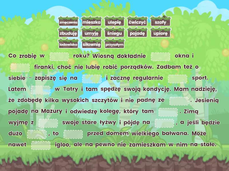 Co zrobię w ____ roku? Wiosną dokładnie ____ okna i ____ firanki, choć nie lubię robić porządków. Zadbam też o siebie – zapiszę się na ____ i zacznę regularnie ____ sport. Latem ____ w Tatry i tam spędzę swoją kondycję. Mam nadzieję, że zdobędę kilka wysokich szczytów i nie padnę ze ____. Jesienią pojadę na Mazury i odwiedzę kolegę, który tam ____. Zimą wyjmę z ____ swoje stare łyżwy i pójdę na ____, a jeśli będzie dużo ____, to ____ przed domem wielkiego bałwana. Może nawet ____ igloo, ale na pewno nie zamieszkam w nim na stałe.