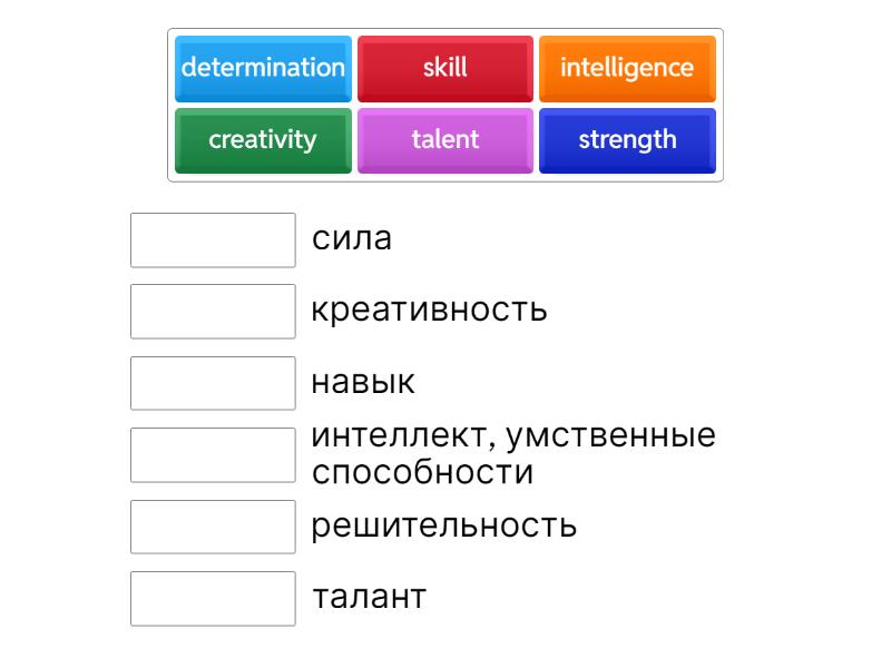 creativity - креативность, intelligence - интеллект, умственные способности, determination - решительность, talent - талант, skill - навык, strength - сила,