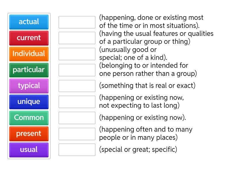 actual - (something that is real or exact)​, current - (happening or existing now, not expecting to last long)​, present - (happening or existing now)., Common - (happening often and to many people or in many places)​, typical - (having the usual features or qualities of a particular group or thing)​, usual - (happening, done or existing most of the time or in most situations)., particular - (special or great; specific), unique - (unusually good or special; one of a kind)., Individual - (belonging to or intended for one person rather than a group),