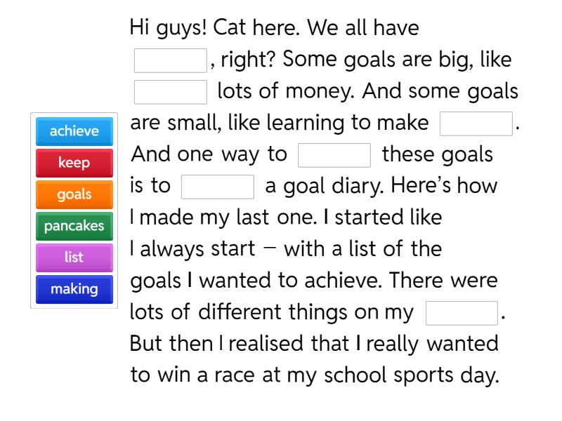 Hi guys! Cat here. We all have ____, right? Some goals are big, like ____ lots of money. And some goals are small, like learning to make ____. And one way to ____ these goals is to ____ a goal diary. Here’s how I made my last one. I started like I always start – with a list of the goals I wanted to achieve. There were lots of different things on my ____. But then I realised that I really wanted to win a race at my school sports day. So, that became my ____ goal. Then, I thought about what I needed to do and how to do it. I ____ my goal into different small steps and ____ them in order. This became my plan and it’s really ____! Once you have a plan, you can create a ____. To do this, I cut ____ a calendar page, put it in my diary and wrote what I needed to do and when I needed to do it. I only had a month and I was trying to do a lot! So, having a timeline was really ____. I followed my list of small steps and ____ off each task. This helped me to achieve my goal and made me feel more ____ too.