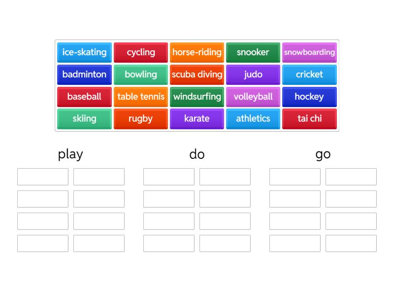 play: badminton, baseball, cricket, hockey, volleyball, table tennis, snooker, rugby, do: athletics, judo, karate, tai chi, go: horse-riding, bowling, cycling, ice-skating, scuba diving, skiing, snowboarding, windsurfing,