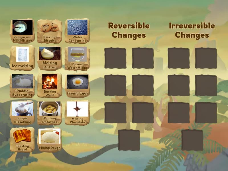 Reversible Changes: Melting Butter, Melting Chocolate, Water Condensing, Puddle Evaporating, Oil and Water Mixing, Sugar Dissolving, ice melting, Irreversible Changes: Baking Biscuits, Frying Eggs, Toasting Bread, Boiling Potatoes, Mixing Dough, Burning Wood, Vinegar and Milk Mixture,