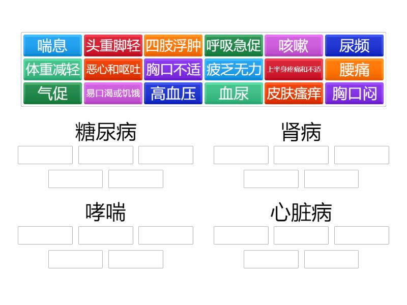 糖尿病: 易口渴或饥饿, 疲乏无力, 尿频, 体重减轻, 肾病: 血尿, 皮肤瘙痒, 四肢浮肿, 腰痛, 高血压, 哮喘: 胸口闷, 咳嗽, 呼吸急促, 喘息, 心脏病: 气促, 胸口不适, 恶心和呕吐, 头重脚轻, 上半身疼痛和不适,