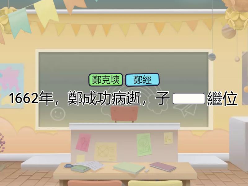 1661年,鄭成功登陸____,圍攻荷蘭人 1662年,鄭成功病逝,子____繼位 1666年,臺南____落成,被譽為「全臺首學」 1683年,清帝國政府派____攻臺