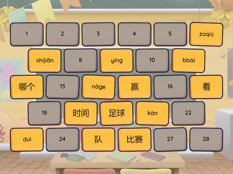 哪个 - nǎge, 队 - duì, 赢 - yíng, 比赛 - bǐsài, 足球 - zúqiú, 看 - kàn, 时间 - shíjiān, 音乐会 - yīnyuèhuì, 就要 - jiùyào, 开始 - kāishǐ, 快 - kuài, 太 - tài, 流行 - liúxíng, 交响乐 - jiāoxiǎngyuè,