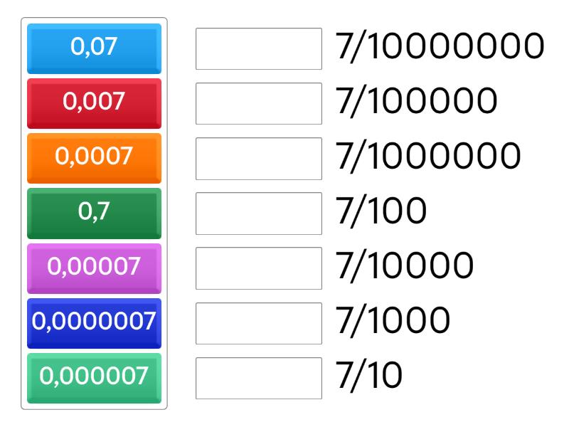 0,7 - 7/10, 0,07 - 7/100, 0,007 - 7/1000, 0,0007 - 7/10000, 0,00007 - 7/100000, 0,000007 - 7/1000000, 0,0000007 - 7/10000000,