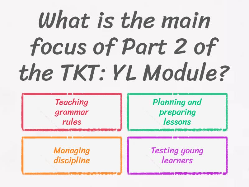 1) What is the main focus of Part 2 of the TKT: YL Module? a) Teaching grammar rules b) Planning and preparing lessons c) Managing discipline d) Testing young learners 2) Which unit focuses on lesson planning? a) Unit 5 b) Unit 6 c) Unit 7 d) All of them 3) Why is lesson planning especially important for young learners? a) To keep teachers busy b) To provide structure and direction in lessons  c) To avoid using materials d) To prepare for exams 4) Unit 6 focuses mainly on: a) Supplementing learning resources b) Designing assessments c) Classroom materials and how to choose them ✅ d) Teacher self-assessment 5) What is the key purpose of additional resources in Unit 7? a) To make lessons longer b) To enrich learning and meet learners’ needs c) To replace lesson plans d) To avoid teacher talk 6) Unit 5 is about selecting and adapting learning resources. a) True b) False 7) Unit 7 asks teachers to think about why additional resources are useful in the classroom. a) True b) False