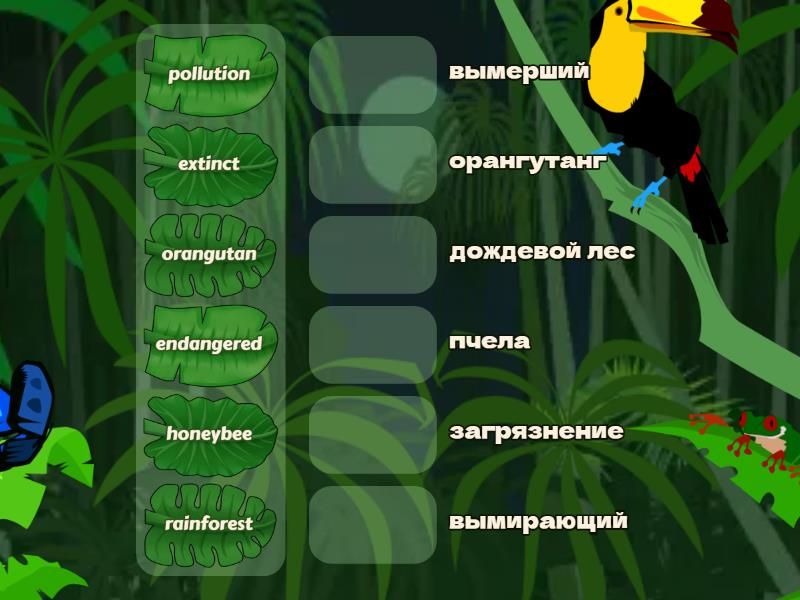 endangered - вымирающий , extinct - вымерший, orangutan - орангутанг, rainforest - дождевой лес, honeybee - пчела, pollution - загрязнение,