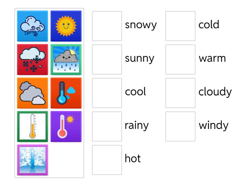 sunny, rainy, cloudy, snowy, windy, hot, cold, cool, warm,