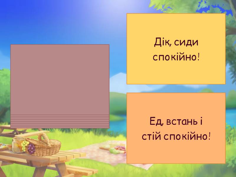 Це його червоний намет., Його червоний намет біля маленького автобуса., То його спина, а це його шия., У Мег є маленький червоний годинник і велика чорна лампа., Її годинник на її парті, Її лампа біля її ручки, У Теда є товстий рудий кіт і чорна качка. Його кіт на його ліжку., Ед, встань і стій спокійно!, Дік, сиди спокійно!.