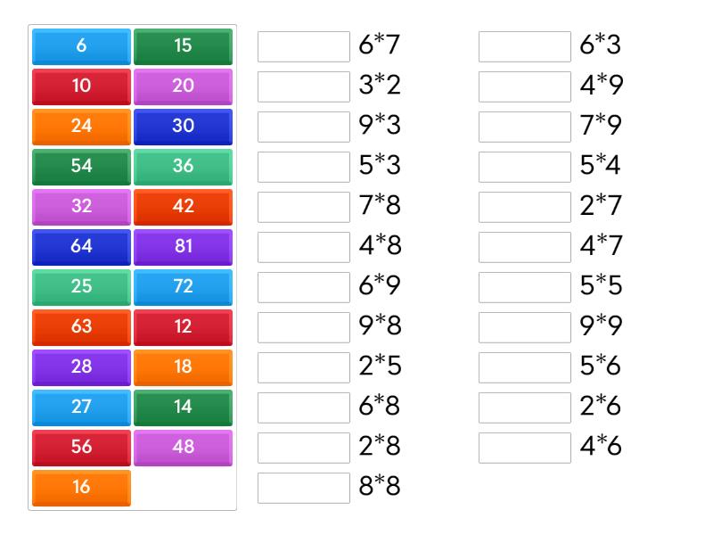 6 - 3*2, 72 - 9*8, 56 - 7*8, 63 - 7*9, 64 - 8*8, 81 - 9*9, 30 - 5*6, 42 - 6*7, 48 - 6*8, 54 - 6*9, 25 - 5*5, 20 - 5*4, 15 - 5*3, 10 - 2*5, 14 - 2*7, 12 - 2*6, 16 - 2*8, 24 - 4*6, 28 - 4*7, 32 - 4*8, 36 - 4*9, 18 - 6*3, 27 - 9*3,