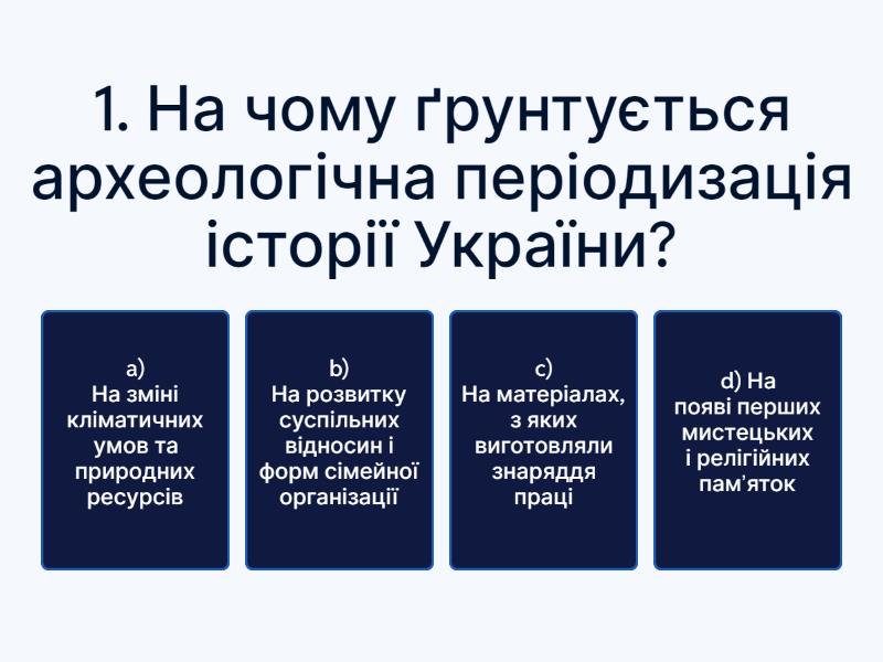 1) 1. На чому ґрунтується археологічна періодизація історії України? a) a) На зміні кліматичних умов та природних ресурсів b) b) На розвитку суспільних відносин і форм сімейної організації c) c) На матеріалах, з яких виготовляли знаряддя праці d) d) На появі перших мистецьких і релігійних пам’яток 2) 2. Коли людина вперше з'явилась на території України? a) а) 1 млн років тому b) b) 0,5 млн років тому c) c) 2 млн років тому  d) d) 1,5 млн років тому 3) 3. Які три основні періоди виділяють у палеоліті? a) a) Мезоліт, Неоліт, Енеоліт b) b) Ранній, Середній, Пізній c) c) Кам’яний, Бронзовий, Залізний d) d) Архантропний, Палеоантропний, Неоантропний 4) 4. Стоянка біля якого села на Закарпатті є найдавнішою на території України? a) a) Амвросіївка b) b) Мізин c) c) Королеве d) d) Кирилівка 5) 5. Які люди населяли територію України в ранньому палеоліті? a) a) Кроманьйонці b) b) Пітекантропи c) c) Неандертальці d) d) Сапієнси 6) 6. Яке було основне знаряддя праці Пітекантропів? a) a) Лук і стріли b) b) Серп c) c) Ручне рубило d) d) Глиняний горщик 7) 7. Яке заняття було провідним у господарстві неандертальців на території України? a) a) Риболовля та приручення тварин b) b) Полювання на великих тварин і збиральництво c) c) Землеробство та скотарство d) d) Металургія та гончарство 8) 8. Яка форма сімейної організації була притаманна неандертальцям? a) a) Батьківський рід b) b) Матріархат c) c) Патріархат d) d) Рабовласницька сім’я 9) 9. Які стоянки належать до пізнього палеоліту? a) a) Мізин, Кирилівка, Межиріч b) b) Амвросіївка, Королеве c) c) Киїк-Коба, Амвросіївка d) d) Трипілля, Усатове 10) 10. Що було знайдено на Мізинській стоянці? a) a) Залізний меч b) b) Лук і стріли c) c) Браслет з меандровим орнаментом d) d) Керамічний посуд 11) 11. У який період вперше з’являється мистецтво та релігія на території України? a) a) Мезоліт b) b) Палеоліт c) c) Неоліт d) d) Енеоліт 12) 12. Який головний винахід мезоліту? a) a) Серп b) b) Лук і стріли c) c) Колесо d) d) Плуг 13) 13. Яка тварина була першою прирученою в мезоліті? a) a) Кінь b) b) Вівця c) c) Вовк (собака) d) d) Корова 14) 14. Який період пов’язаний з переходом до відтворювального господарства? a) a) Мезоліт b) b) Неоліт c) c) Палеоліт d) d) Енеоліт 15) 15. Як називають зміни, пов’язані з виникненням землеробства і скотарства? a) a) Технічна революція b) b) Кам’яна революція c) c) Неолітична революція d) d) Соціальна революція 16) 16. Який новий спосіб виготовлення знарядь праці з’явився в неоліті? a) a) Кування b) b) Шліфування c) c) Плавка бронзи d) d) Використання заліза 17) 17. Які нові продукти люди почали виготовляти в неоліті? a) a) Скло і метал b) b) Тканини і кераміку c) c) Бронзові прикраси d) d) Папір і пергамент 18) 18. Який спосіб життя почав переважати в неоліті? a) a) Кочовий b) b) Мисливський c) c) Осілий d) d) Рабовласницький 19) 19. У який період люди почали систематично використовувати свійських тварин як тяглову силу? a) a) Мезоліт b) b) Неоліт c) c) Пізній палеоліт d) d) Енеоліт 20) 20. Який головний демографічний процес неолітичної революції? a) a) Зменшення кількості людей b) b) Зростання кількості та розмірів поселень c) c) Вимирання цілих племен d) d) Перехід до кочування