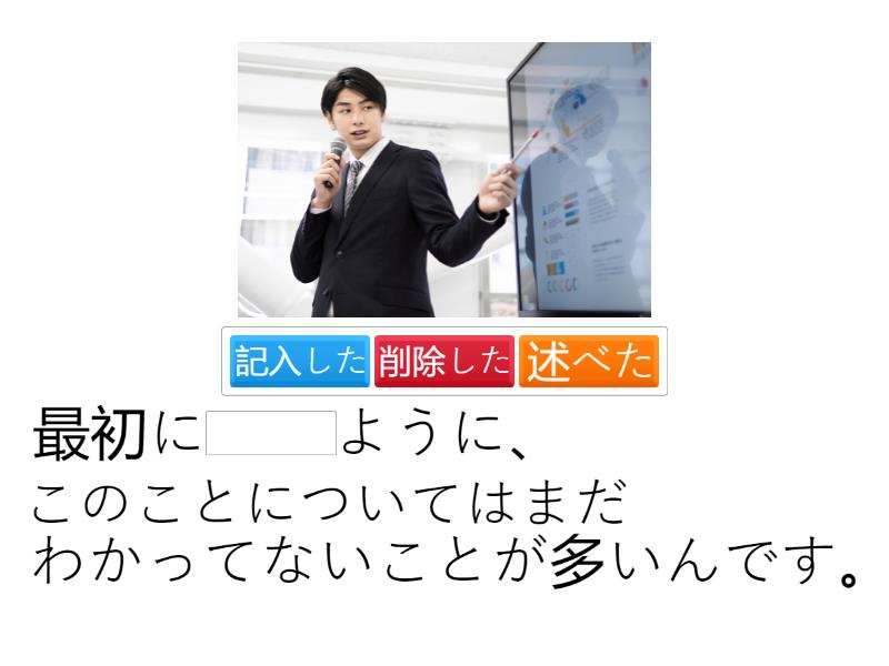 それはどういう____ですか。 --税金に関する書類です。 見て!うちの社長が 雑誌に____る。 この表現はちょっと問題があるので、 ____することにしました。 もうちょっと楽しい ____に変えましょう。 大勢の前だと、うまく ____んです。 会議では積極的に ____してください。 最初に____ように、 このことについてはまだ わかってないことが多いんです。 この日本語を英語に ____ばいいんですね。 新監督は、チームの 今後の目標について____。 目上の人には、____に 気をつけてください。