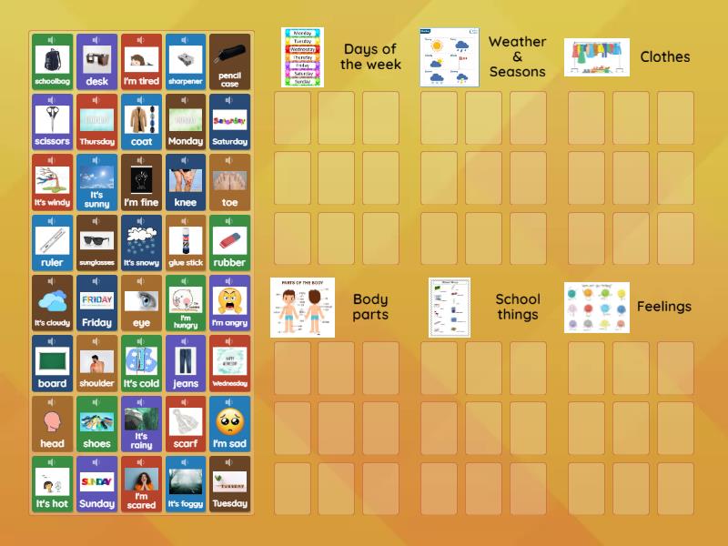 Days of the week: Monday, Tuesday, Wednesday, Thursday , Friday, Saturday, Sunday, Weather & Seasons: It's sunny, It's windy, It's cloudy, It's foggy, It's snowy , It's rainy, It's hot, It's cold, Clothes : coat, scarf, sunglasses, jeans, shoes, Body parts: head, shoulder, knee, toe, eye, School things: schoolbag, pencil case, sharpener, rubber, ruler, scissors, glue stick, board, desk, Feelings: I'm fine, I'm sad, I'm tired, I'm hungry, I'm angry, I'm scared,