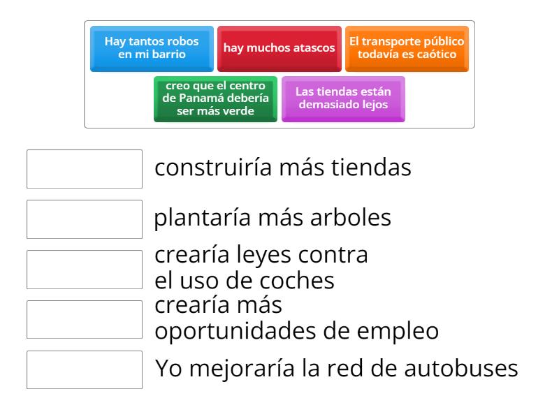 creo que el centro de Panamá debería ser más verde - plantaría más arboles, El transporte público todavía es caótico - Yo mejoraría la red de autobuses, Hay tantos robos en mi barrio - crearía más oportunidades de empleo, Las tiendas están demasiado lejos - construiría más tiendas , hay muchos atascos - crearía leyes contra el uso de coches ,