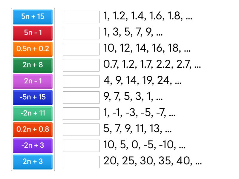 2n - 1 - 1, 3, 5, 7, 9, ..., 5n - 1 - 4, 9, 14, 19, 24, ..., -5n + 15 - 10, 5, 0, -5, -10, ..., 2n + 3 - 5, 7, 9, 11, 13, ..., -2n + 11 - 9, 7, 5, 3, 1, ..., 0.2n + 0.8 - 1, 1.2, 1.4, 1.6, 1.8, ..., 5n + 15 - 20, 25, 30, 35, 40, ..., -2n + 3 - 1, -1, -3, -5, -7, ..., 0.5n + 0.2 - 0.7, 1.2, 1.7, 2.2, 2.7, ..., 2n + 8 - 10, 12, 14, 16, 18, ...,