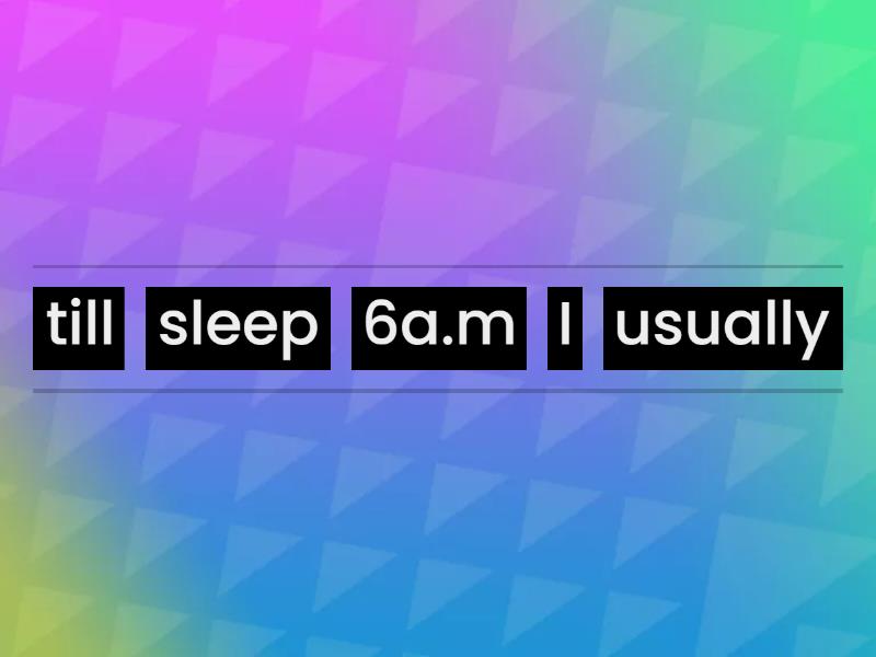 I usually sleep till 6a.m, My mom doesn't often listen to music, Where do you usually meet your friends?, How often do you travel by train?, He is never late to school, My dad seldom goes to the stadium, He doesn't always play computer games, My friend is never sad , When do you usually watch TV?, We don't often travel by underground, How often does your dad drive you to school?, We hardly ever go to the restaurant, My sister doesn't often eat vegetables , She does not usually go to the gym,