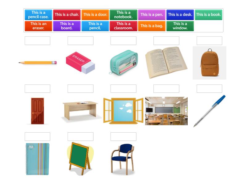 This is a bag., This is a book., This is a chair., This is a classroom., This is a desk., This is an eraser., This is a notebook., This is a pen., This is a pencil., This is a pencil case., This is a board., This is a door., This is a window.,
