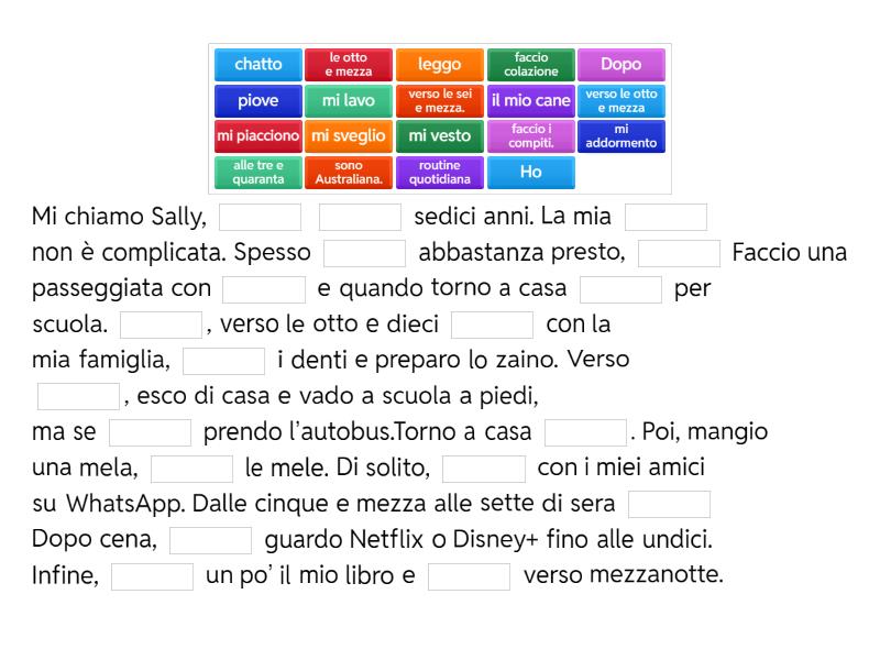 Mi chiamo Sally, ____ ____ sedici anni. La mia ____ non è complicata. Spesso ____ abbastanza presto, ____ Faccio una passeggiata con ____ e quando torno a casa ____ per scuola. ____, verso le otto e dieci ____ con la mia famiglia, ____ i denti e preparo lo zaino. Verso ____, esco di casa e vado a scuola a piedi, ma se ____ prendo l’autobus.Torno a casa ____. Poi, mangio una mela, ____ le mele. Di solito, ____ con i miei amici su WhatsApp. Dalle cinque e mezza alle sette di sera ____ Dopo cena, ____ guardo Netflix o Disney+ fino alle undici. Infine, ____ un po’ il mio libro e ____ verso mezzanotte.