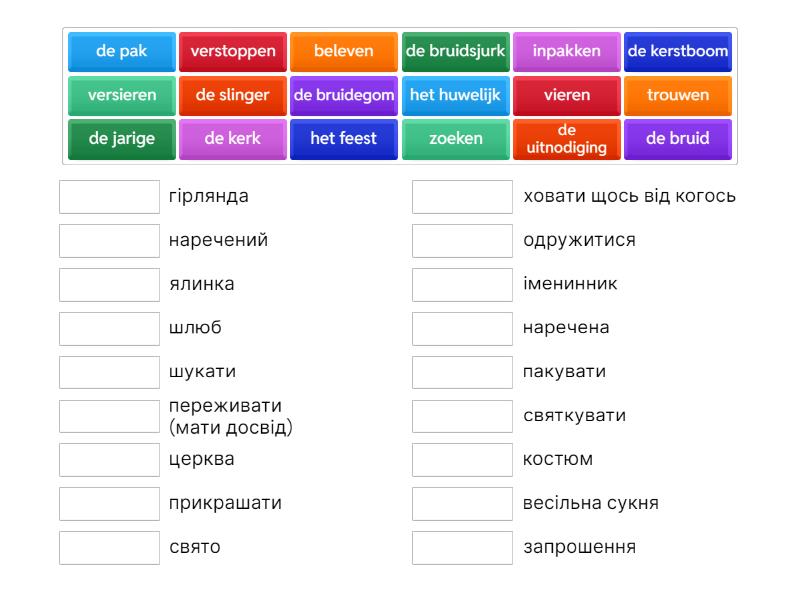 het feest - свято, de slinger - гірлянда, vieren - святкувати, de jarige - іменинник, de uitnodiging - запрошення, inpakken - пакувати, de bruid - наречена, de bruidegom - наречений, het huwelijk - шлюб, trouwen - одружитися, de kerk - церква, verstoppen - ховати щось від когось, zoeken - шукати, de bruidsjurk - весільна сукня, de pak - костюм, versieren - прикрашати, de kerstboom - ялинка, beleven - переживати (мати досвід),