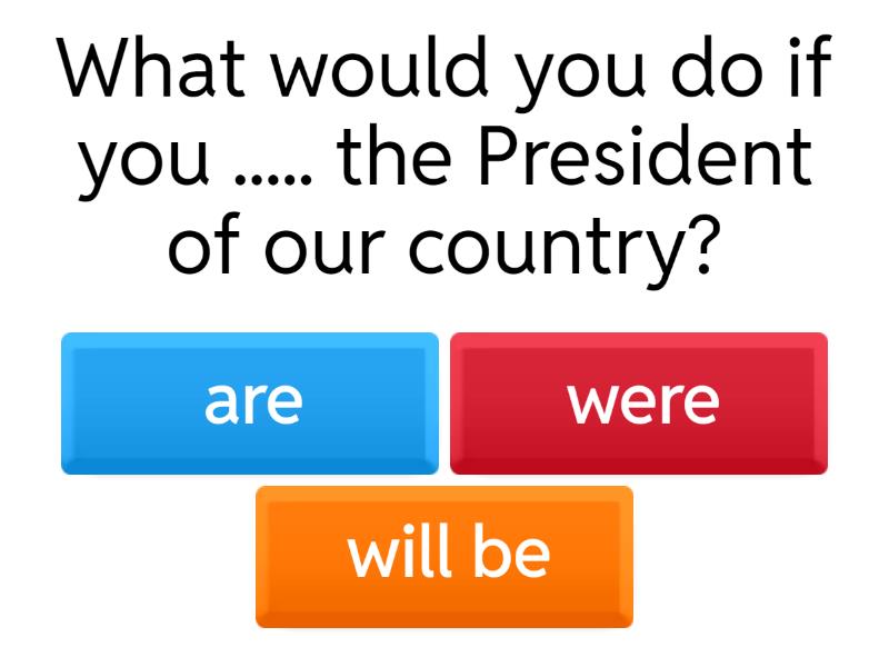1) What would you do if you ..... the President of our country? a) are b) were c) will be 2) If more people ..... public transport, there would be less pollution. a) use b) would use c) used 3) If you ..... rich, what car would you have? a) are b) were c) would be 4) If you .......... a Maths test, what would you do? a) forget b) forgot c) would forget 5) If I went to Russia, I ..... the Red Square. a) would visit b) visited c) would visited 6) I ..... more exercise if I were you. a) do b) did c) would do 7) I ..... to him if I were you. a) don't listen b) didn't listen c) wouldn't listen 8) If I .... the answer, I .....you! a) know - would tell b) knew - would tell c) knew - would say 9) I .... that, if I were in your shoes. a) didn't do b) wouldn't do c) won't do 10) If I had to move to another country, I......... . a) refused b) will refuse c) 'd refuse
