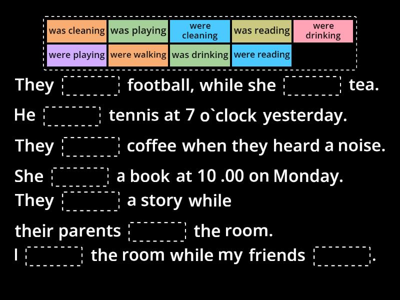 They ____ football, while she ____ tea. He ____ tennis at 7 o`clock yesterday. They ____ coffee when they heard a noise. She ____ a book at 10 .00 on Monday. They ____ a story while their parents ____ the room. I ____ the room while my friends ____.