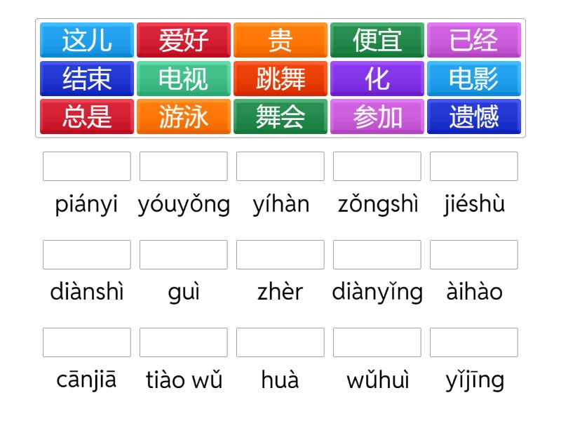 电影 - diànyǐng, 参加 - cānjiā, 跳舞 - tiào wǔ, 爱好 - àihào, 这儿 - zhèr, 舞会 - wǔhuì, 已经 - yǐjīng, 结束 - jiéshù, 遗憾 - yíhàn, 贵 - guì, 便宜 - piányi, 总是 - zǒngshì, 电视 - diànshì, 化 - huà, 游泳 - yóuyǒng,
