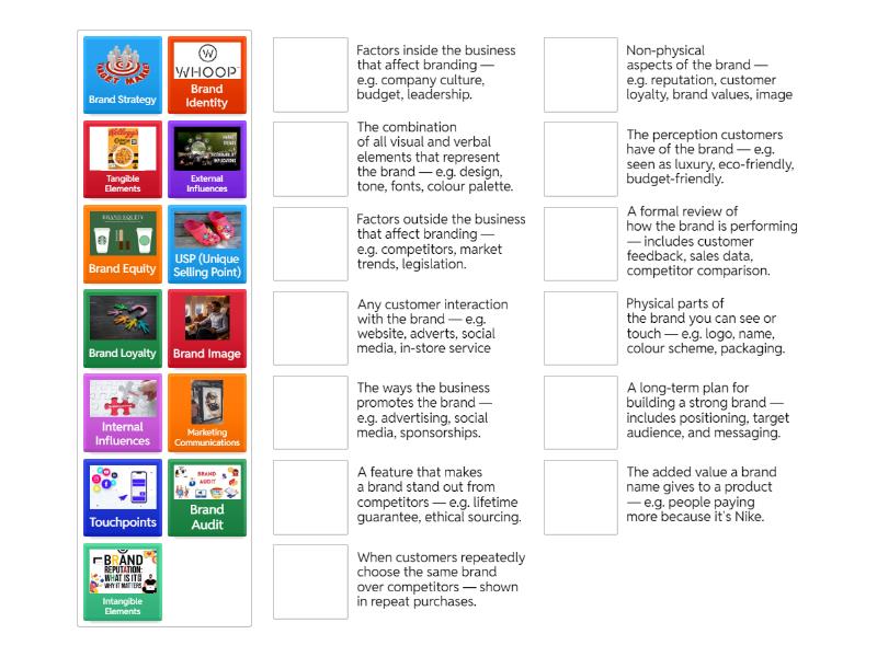 Tangible Elements - Physical parts of the brand you can see or touch — e.g. logo, name, colour scheme, packaging., Intangible Elements - Non-physical aspects of the brand — e.g. reputation, customer loyalty, brand values, image, Touchpoints - Any customer interaction with the brand — e.g. website, adverts, social media, in-store service, Brand Identity - The combination of all visual and verbal elements that represent the brand — e.g. design, tone, fonts, colour palette., Brand Image - The perception customers have of the brand — e.g. seen as luxury, eco-friendly, budget-friendly., Brand Loyalty - When customers repeatedly choose the same brand over competitors — shown in repeat purchases., Brand Equity - The added value a brand name gives to a product — e.g. people paying more because it’s Nike., USP (Unique Selling Point) - A feature that makes a brand stand out from competitors — e.g. lifetime guarantee, ethical sourcing., Internal Influences - Factors inside the business that affect branding — e.g. company culture, budget, leadership., External Influences - Factors outside the business that affect branding — e.g. competitors, market trends, legislation., Brand Strategy - A long-term plan for building a strong brand — includes positioning, target audience, and messaging., Marketing Communications - The ways the business promotes the brand — e.g. advertising, social media, sponsorships., Brand Audit - A formal review of how the brand is performing — includes customer feedback, sales data, competitor comparison.,