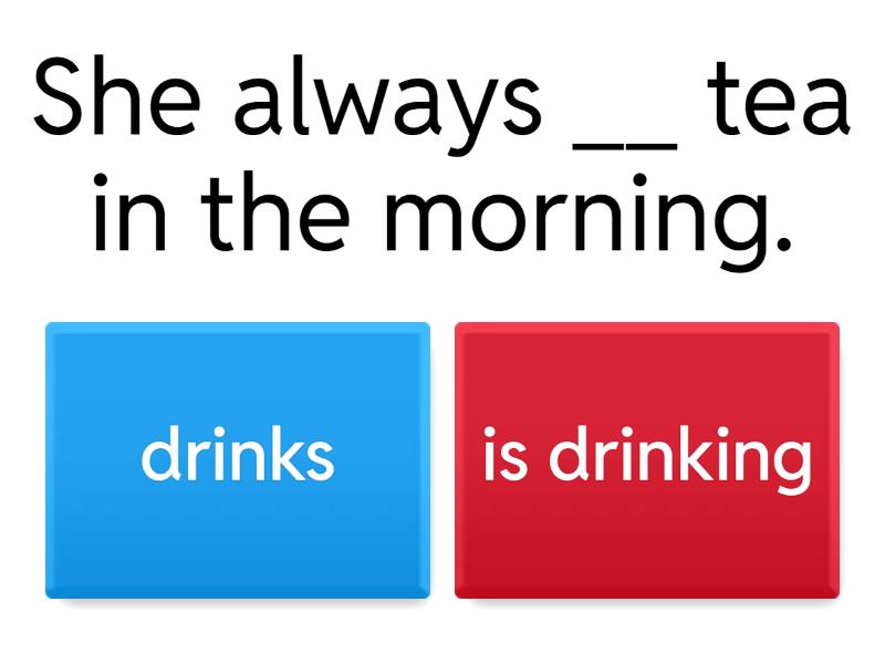 1) She always __ tea in the morning. a) drinks b) is drinking 2) She __ a book now. a) is reading b) reads 3) They usually __ football after school. a) plays b) play 4) He never __ pizza on Mondays. a) is eating b) eats 5) They __ football at the moment. a) is playing b) are playing 6) He __ pizza right now. a) eats b) is eating 7) We often __ TV in the evening. a) watch b) watches 8) I sometimes __ books before bed. a) read b) reads 9) I __ an email at the moment. a) am writing b) am writeing 10) We __ TV this evening. a) are watching b) watch 11) She always __ breakfast at 7 o’clock. a) eats b) is eating 12) __ you often __ books before bed? a) do, reads b) do, read 13) They __ (not) football at the moment. a) aren’t playing b) don’t play 14) __ you __ your homework right now? a) are, doing b) do, doing 15) He __ (not) at the moment. a) isn’t sleeping b) doesn’t sleep 16) __ he usually __ his grandparents at the weekend? a) does, visit b) does, visits 17) __ you __ to music now? a) do, listening b) are, listening 18) We often __ English at school. a) speaks b) speak 19) He __ (not) in the park right now. a) isn’t running b) don’t running 20) He __ (not) football on Mondays. a) doesn’t, play b) aren’t, playing 21) My sister never __ coffee in the morning. a) drink b) drinks 22) She __ to her friend right now. a) talks b) is talking