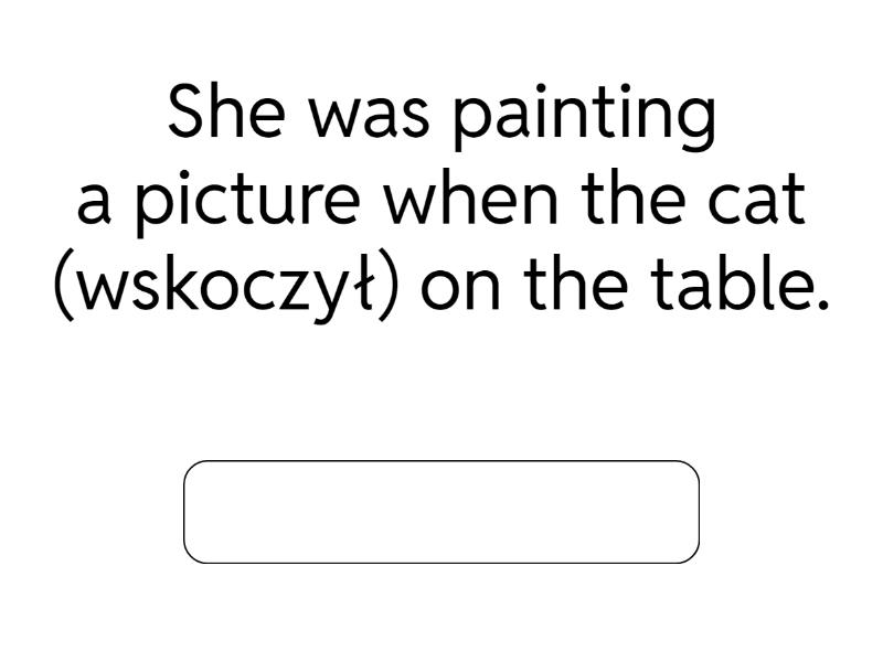 While I was studying, my brother (słuchał) to music., She was painting a picture when the cat (wskoczył) on the table., They were dancing when the DJ (zmienił) the song., He (naprawiał) his bike when it started to snow., We (rozmawialiśmy) when the teacher entered the classroom., I (pisałam) a letter when the postman knocked on the door., She (przypaliła) the cake while she was chatting on the phone., We met some tourists while we (spacerowaliśmy) around the city., He was running fast when he suddenly (upadł)., The kids (bawiły się) in the garden while their mum was cleaning windows..