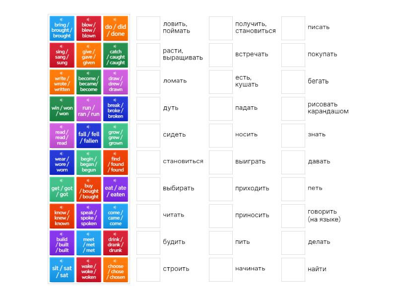 become / became/ become - становиться, begin / began / begun - начинать, blow / blew / blown - дуть, break / broke / broken - ломать, choose / chose / chosen - выбирать, come / came / come - приходить, draw / drew / drawn - рисовать карандашом, eat / ate / eaten - есть, кушать, drink / drank / drunk - пить, fall / fell / fallen - падать, find / found / found - найти, get / got / got - получить, становиться, give / gave / given - давать, grow / grew / grown - расти, выращивать, know / knew / known - знать, meet / met / met - встречать, read / read / read - читать, run / ran / run - бегать, sing / sang / sung - петь, sit / sat / sat - сидеть, speak / spoke / spoken - говорить (на языке), wake / woke / woken - будить, wear / wore / worn - носить, win / won / won - выиграть, write / wrote / written - писать, bring / brought / brought - приносить, build / built / built - строить, buy / bought / bought - покупать, catch / caught / caught - ловить, поймать, do / did / done - делать,