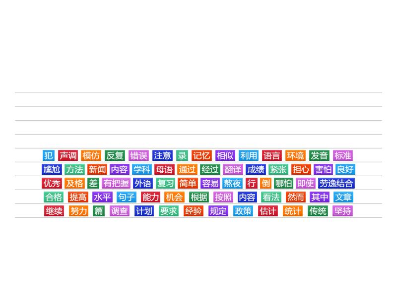 犯, 声调, 模仿, 反复, 错误, 注意, 录, 记忆, 相似, 利用, 语言, 环境, 发音, 标准, 尴尬, 方法, 新闻, 内容, 学科, 母语, 通过, 经过, 翻译, 成绩, 紧张, 担心, 害怕, 良好, 优秀, 及格, 差, 有把握, 外语, 复习, 简单, 容易, 熬夜, 行, 倒, 哪怕, 即使, 劳逸结合, 合格, 提高, 水平, 句子, 能力, 机会, 根据, 按照, 内容, 看法, 然而, 其中, 文章, 继续, 努力, 篇, 调查, 计划, 要求, 经验, 规定, 政策, 估计, 统计, 传统, 坚持.