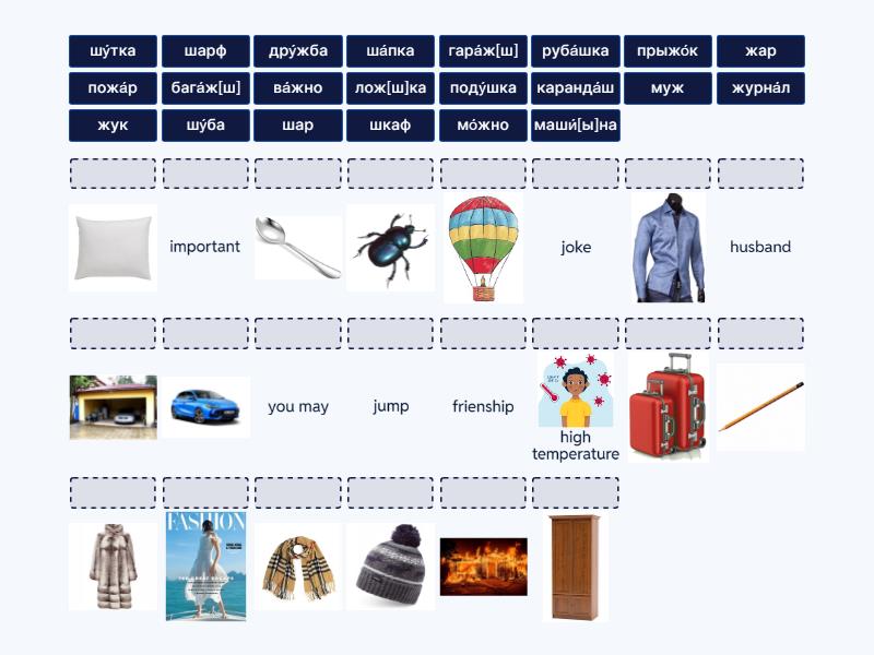 шар, жар - high temperature , жук, шарф, муж - husband, шкаф, ша́пка, шу́тка - joke, шу́ба, дру́жба - frienship, ва́жно - important, мо́жно - you may, лож[ш]ка, пожа́р, прыжо́к - jump, журна́л, гара́ж[ш], бага́ж[ш], маши́[ы]на, руба́шка, поду́шка, каранда́ш,